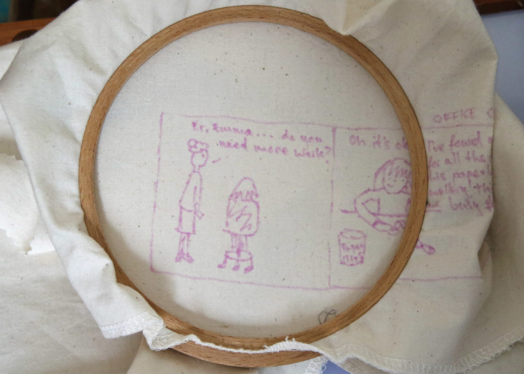 It is amazing how you sewed the tiny script. I can totally relate to your comic strip!