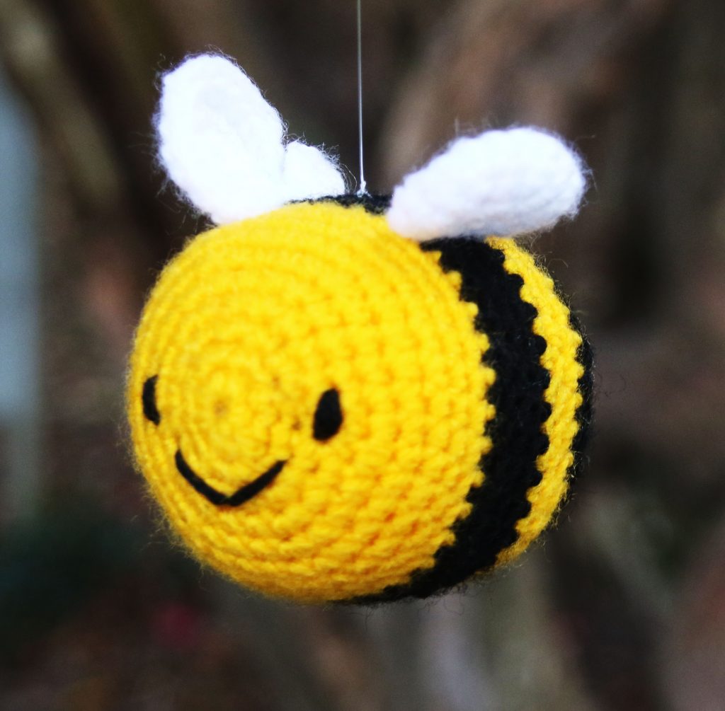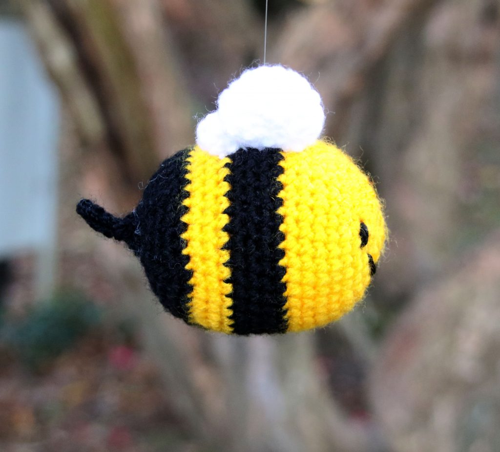 The crocheted bee mobile was a lot of fun to make. I used clear nylon string to attach them to an embroidery hoop for the top of the mobile. Acrylic yarn was used so it should be hard-wearing.