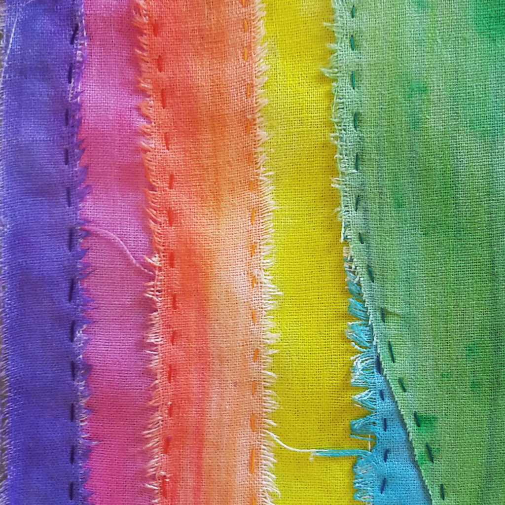 I used Dylon fabric paints and Derwent Intense Blocks to colour the strips of linen, and then sewed them together by hand with running stitch.
