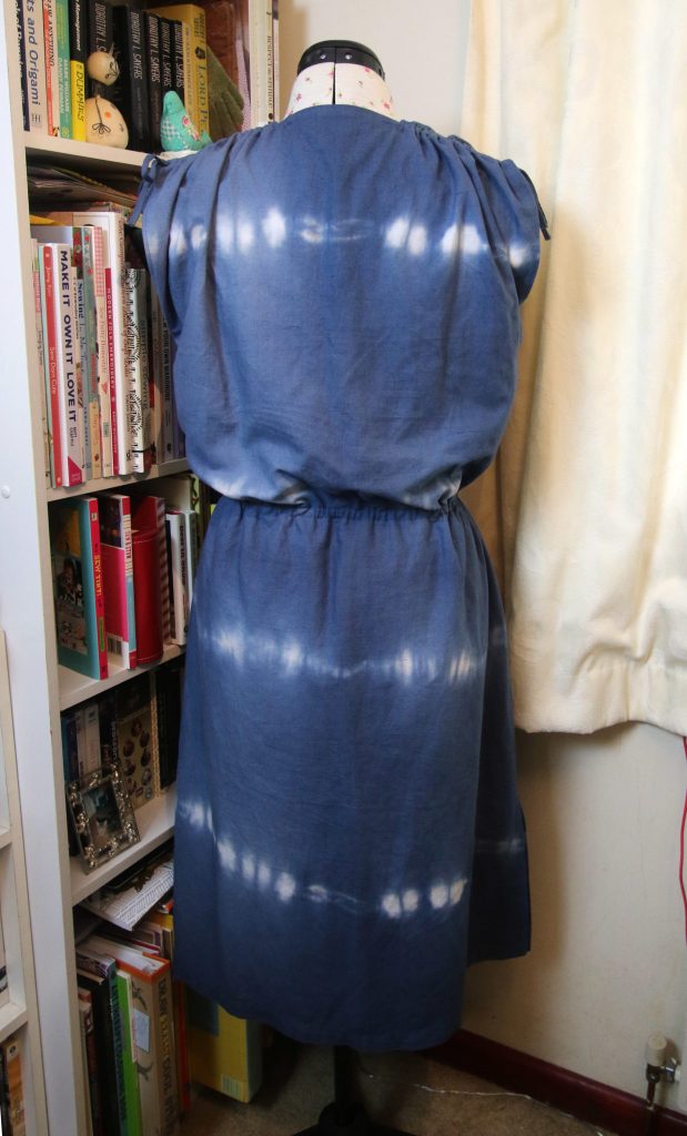 From a charity shop – looks like part of a cotton bed sheet as it had a hem on one side. Shibori-dyed in what looks like a denim blue.