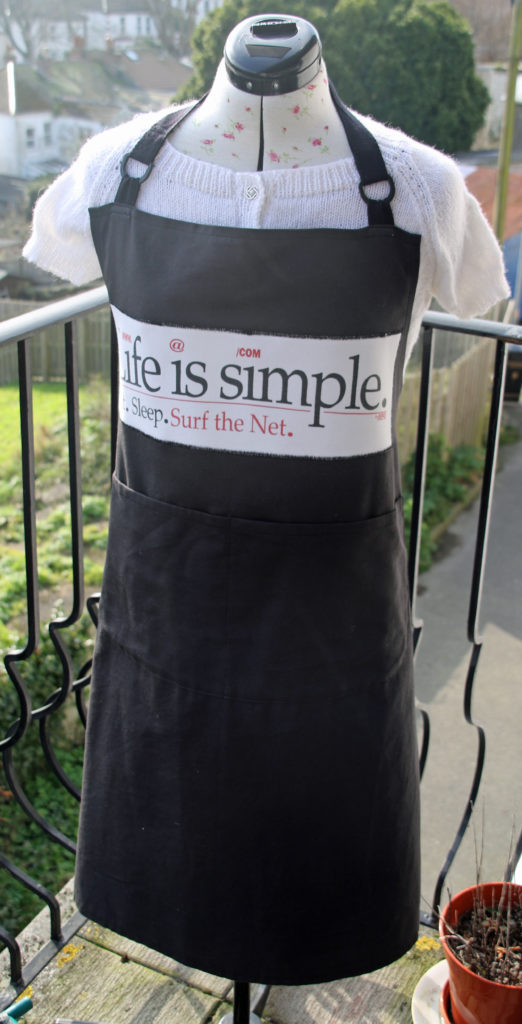I used the original apron to work out where to place the pocket. As the t shirt motif was so long, its placement was decided by how close to the top I could get it to go! It was stitched on with two layers of zigzag stitch.